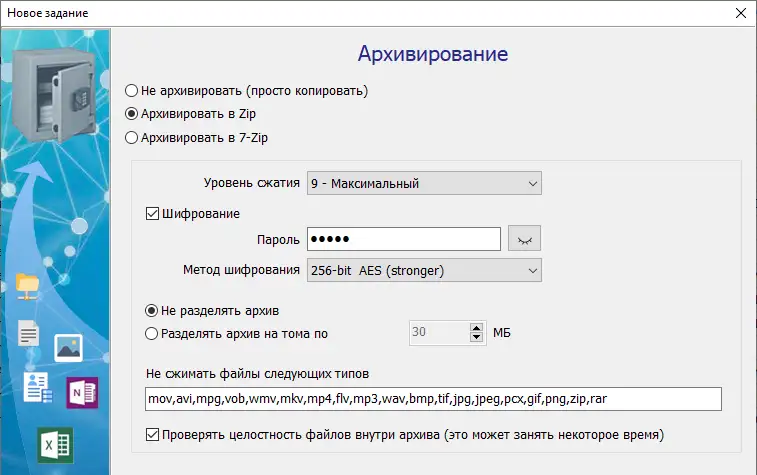 Если нужно архивировать данные в ZIP, 7-Zip и шифровать их, всё это можно настроить. Выбираем сжатие в ZIP или 7-Zip, уровень сжатия - максимальный, шифрование 256 bit AES и установим пароль на архив (все таки в облаке будем хранить данные). Проверку целостности архива – тоже установим на всякий случай.
