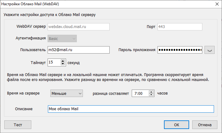 Кликаем по кнопке "Автоматически", чтобы определить время на сервере в Облаке Mail и кнопку "Тест" для проверки соединения. Затем "ОК" для сохранения подключения.