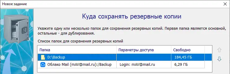 Как и договаривались выше, для надежности укажем 2 места хранения резервных копий: в локальной папке "D:\BACKUP" и дополнительно будем дублировать в Облако Mail.