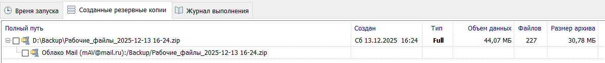 После окончания выполнения задания, на вкладке "Созданные резервные копии" появится резервная копия.