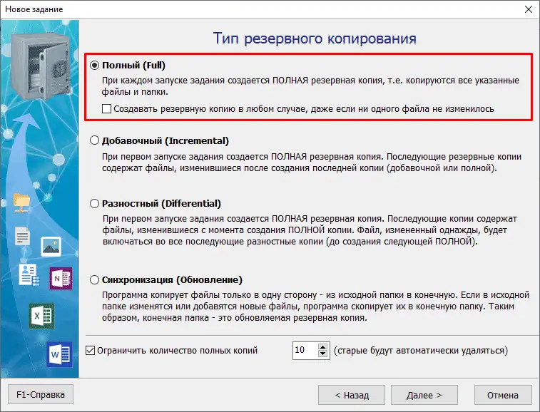 Появится мастер, в котором укажите Тип резервного копирования Полный (Full)