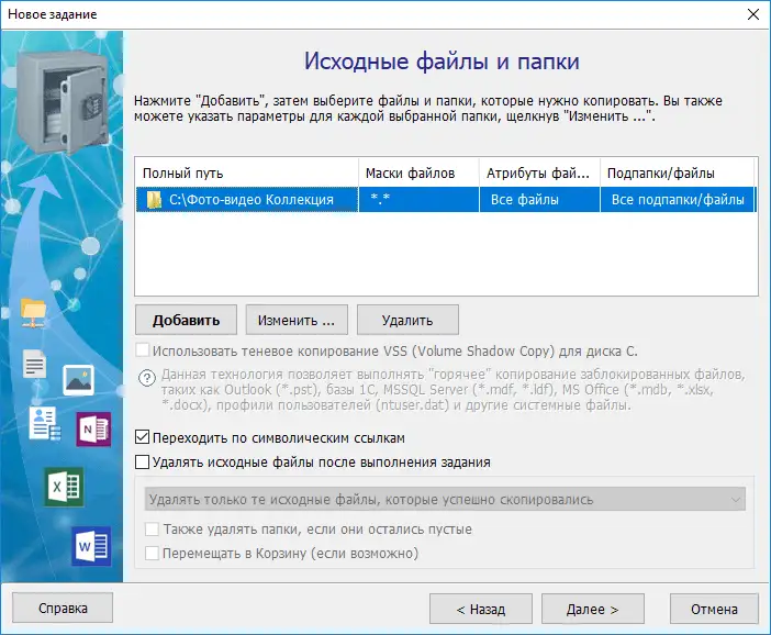 Нажмите "Далее" и укажите вашу исходную папку с photo/video, которую следует резервировать (дублировать) на внешний диск.