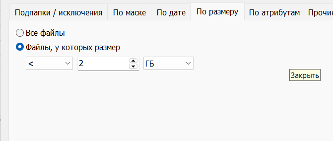 На вкладке "по размеру" - здесь указываются какие копировать. Ну можно дописать слово "Копировать", чтобы стало так "Копировать файлы, у которых размер ...". Ладно, допишем.