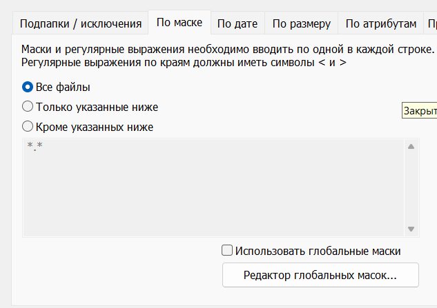 На вкладке "по маске" там есть выбор, с какими масками копировать (Только указанные ниже) или с какими масками пропускать (Кроме указанных ниже).