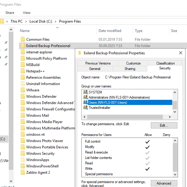 Мы уже ранее имели проблемы с доступом файлов на запись, если программа устанавливается в C:\Program Files или C:\Program Files (x86). Это особые папки и желательно избегать установку программы в них. Поэтому наш инсталлятор и предлагает по-умолчанию папку C:\Exiland Backup Professional. Но Вы всё равно решили установить програму в C:\Program Files
