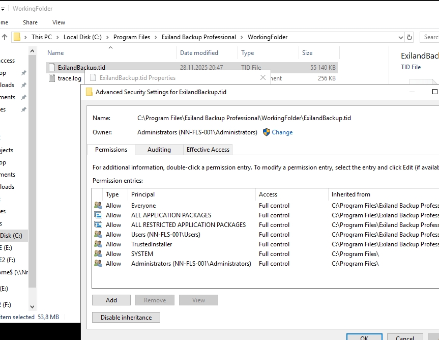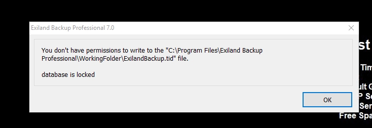 1) Проверьте в ствйствах файла "C:\Program Files\Exiland Backup Professional\WorkingFolder\ExilandBackup.tid" на вкладке "Общие" нет ли внизу блокировки. Если есть - разблокируйте файл.