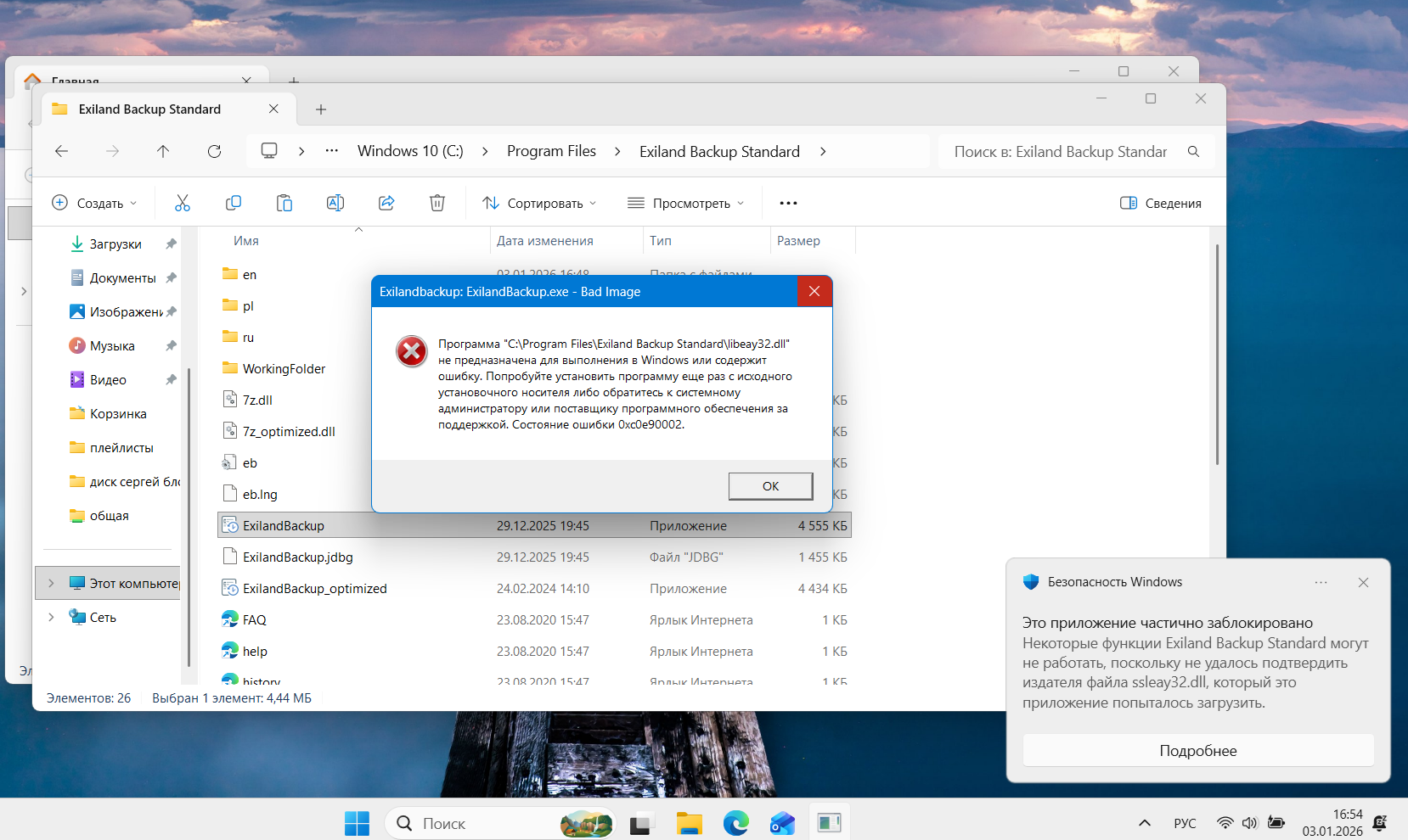 Для начала я бы переустановил программу в папку C:\Exiland Backup Standard и проверил блокировку в свойствах каждого файла.